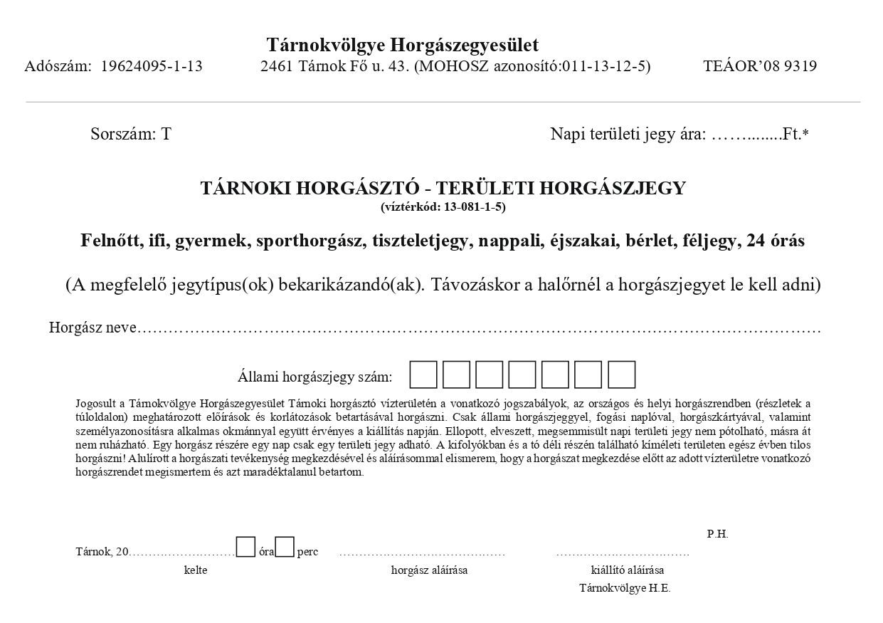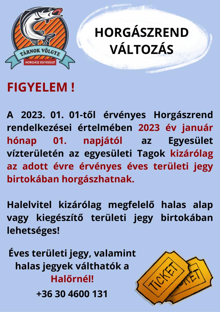 A 2023. 01. 01-től érvényes Horgászrend rendelkezései értelmében 2023 év január hónap 01. napjától az Egyesület vízterületén az egyesületi Tagok kizárólag az adott évre érvényes éves területi jegy birtokában horgászhatnak.